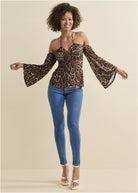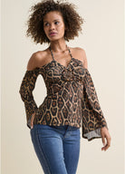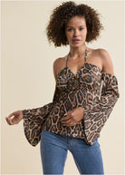 This halter top abounds with details! The front medallion complements the allover animal print that takes this top to the wild side. Off-the-shoulder bell sleeves add volume to the fitted bodice, while the halter tie can be worn straight around the neck or crisscrossed for a little something extra. * Sizes: XS (2), S (4-6), M (8-10), L (12-14), XL (16) * Plus sizes: 1X (18-20), 2X (22-24), 3X (26-28) * Print placement may vary * Functional halter tie neck * Cold shoulder bell sleeves * Embellished front detail * 24" approx. length; varies by size * Fabric has stretch * Poly/spandex. Imported