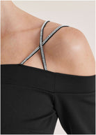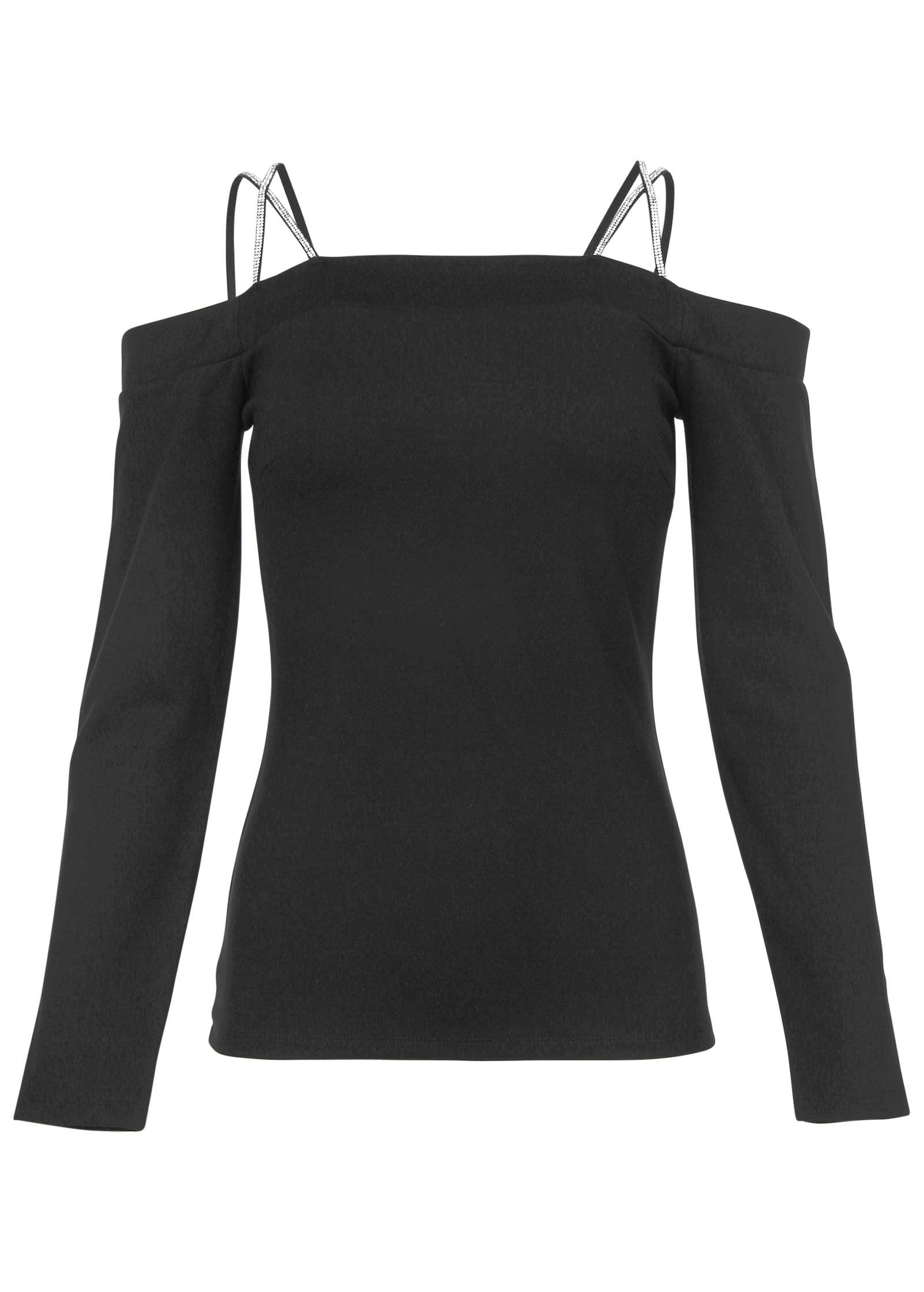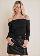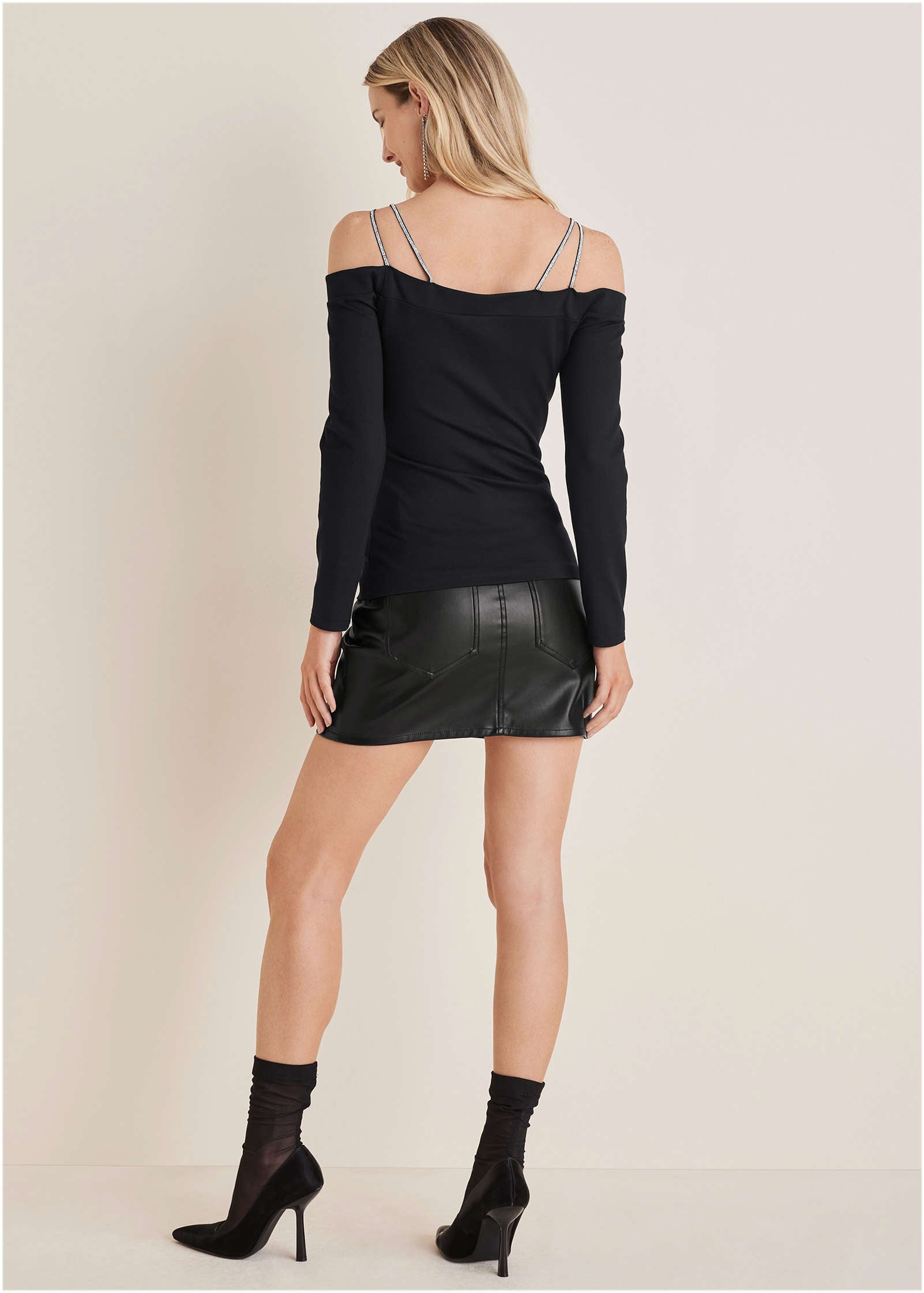 A little bling can pack some serious punch. Look no further than this top, which features rhinestone straps to keep it in place. Long sleeves balance the exposed shoulder, and the stretchy fabric provides a figure-skimming fit. Wear it with a mini skirt (preferably in faux leather) and heels for a night on the town or balance the glam with denim and boots for daytime.