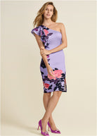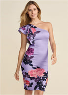 Dramatic one-shoulder styling with a ruffled sleeve assures this midi dress makes an instant statement! The smooth-fitting knee-length silhouette has a side slit to balance the one shoulder and zips up the side for a seamless front and back look.