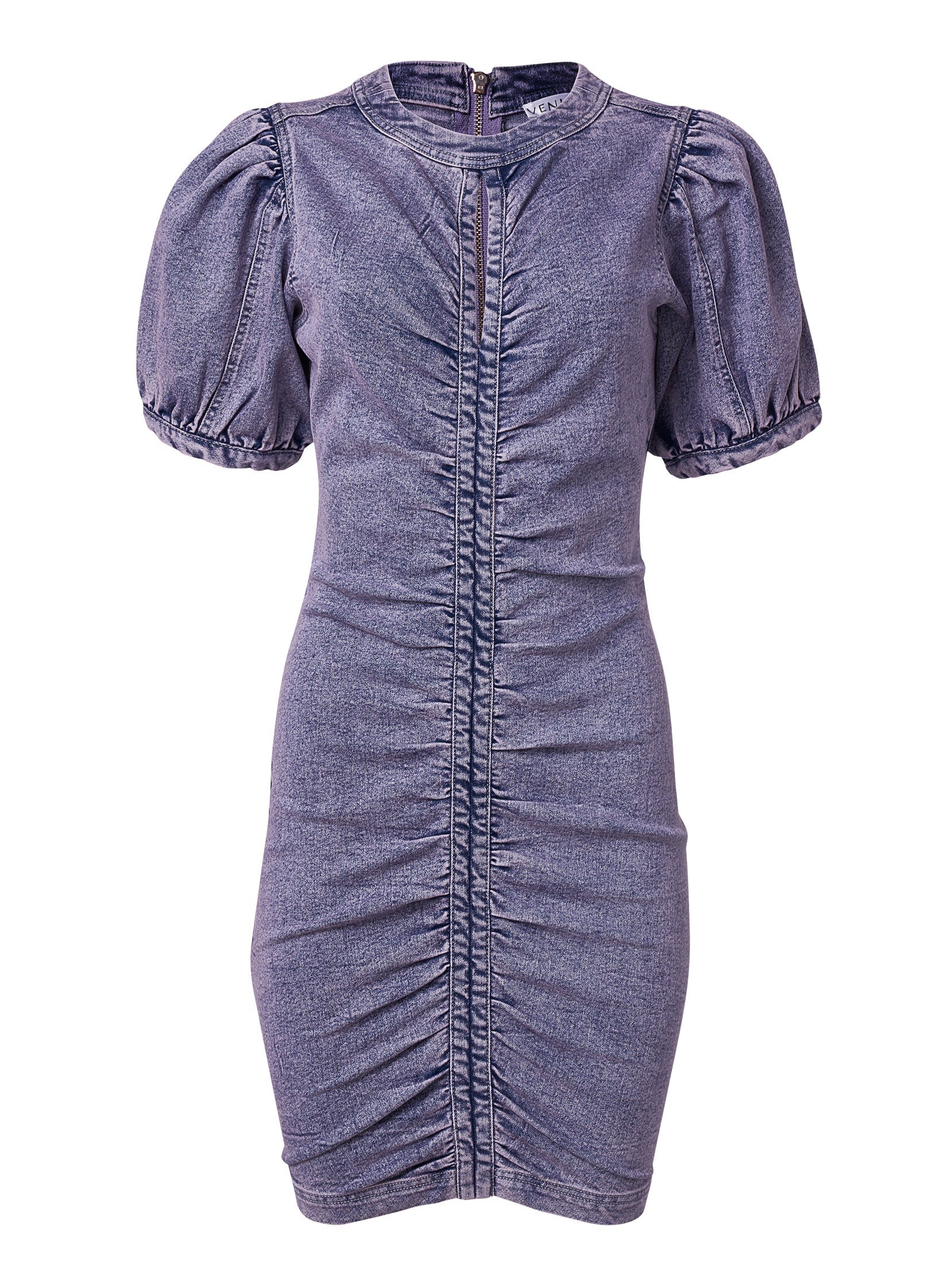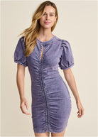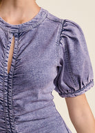 Short, puffy sleeves with gathers at both shoulders balance the figure-loving ruching that spans across the front of this short denim dress. The structured collar and seams down the front and back keep this mini dress ready for spontaneous adventures. Zip up the back and let the fun begin!