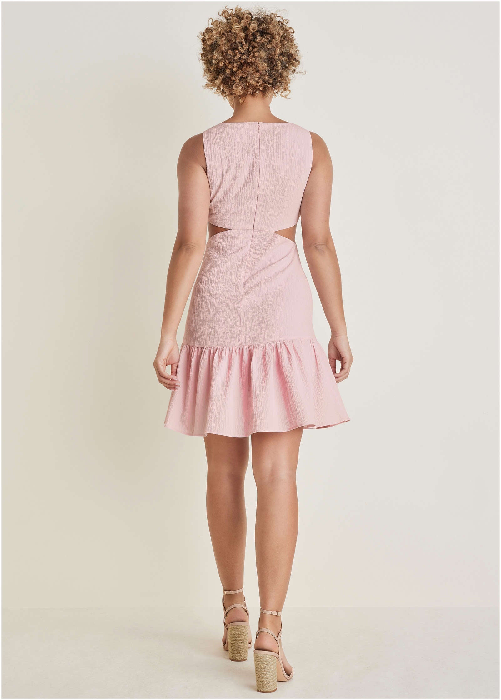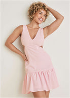Flirty, frilly and fun! This mini dress is feminine to its core, with a fluted skirt and playful cutouts that can be dressed up or down. The satin provides an elevated look, while the sleeveless silhouette and plunging V-neck scream summer. Embrace the frills, don some heels and dance the night away at your next summer event or steamy date night. * Sizes: XS (2), S (4-6), M (8-10), L (12-14), XL (16) * Plus sizes: 1X (18-20), 2X (22-24), 3X (26-28) * V-neck * Sleeveless * Back zipper closure * Side cutouts * Ruffle hem * Mini length, 35" from shoulder * Lined * Polyester/Lycra. Imported