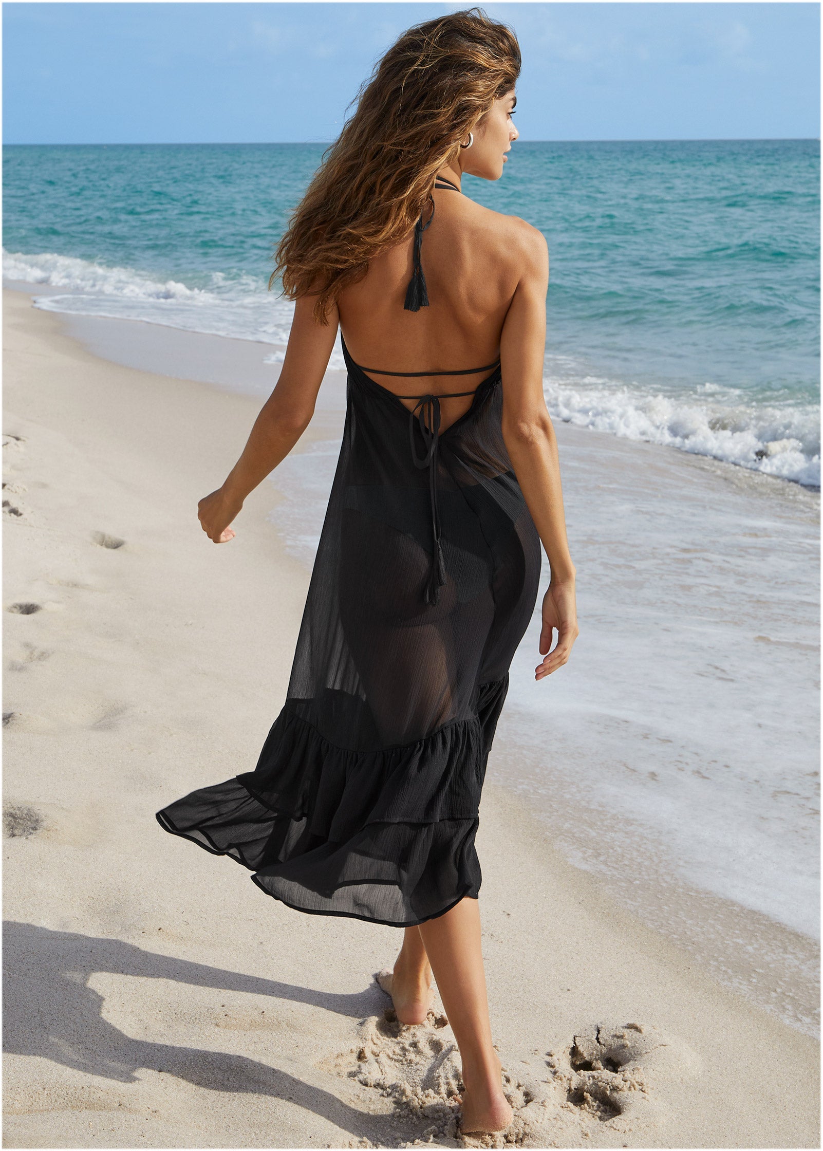 Sheer and light as air, this dress is everything a beach cover-up should be: just enough to throw on post swim while still allowing your suit to peek through. Cinched below the bust then flowing out into a floaty silhouette with a flouncy tier at the hem, you'll look like a total goddess in it. Oh, and we should mention that it packs down to nothing, which means more suitcase space for all your bikinis.