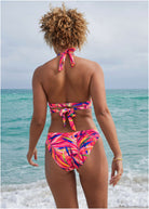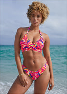 This bikini top has a secret: a hidden underwire! Get the sleek look of a wrap top but with extra shaping and support built into the cups. Ring hardware at the front of the straps plus two adjustable bands in the back give a cool edge to the flattering fit.