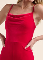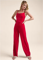 The perfect plus-one for your next occasion, this sleeveless velvet jumpsuit offers up a sleek look and silky-smooth feel. With a back zip closure and adjustable spaghetti straps that lead to a low and squared-off back, this jumpsuit is shaped with an elevated cowl neck bodice and chic wide pant legs. * Sizes: XS (2), S (4-6), M (8-10), L (12-14), XL (16) * Plus sizes: 1X (18-20), 2X (22-24), 3X (26-28) * Back zipper closure * 33" inseam * Poly/spandex. Imported