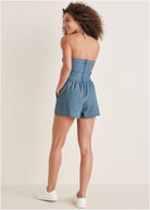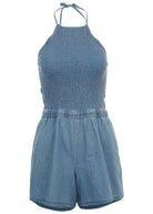 This chambray romper is great at getting you ready fast on warm days. Offering a chic look in one piece, this instant outfit features a halter neckline that shows off sunkissed shoulders, an eye-catching smocked bodice, a flattering defined waistline and easy relaxed shorts. We love it paired with sneakers for on-the-go moments or with sandals and a clutch for dressier days. * Sizes: XS (2), S (4-6), M (8-10), L (12-14), XL (16) * 4" inseam * Halter neckline * Smocked bodice * Back zipper closure * Elastic waist * Cotton. Imported