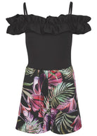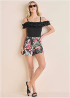This off-the-shoulder romper is your go-to for easy, breezy style with a touch of flair. The ruffled neckline brings the drama, while the printed bottoms add a playful vibe. Whether you're strolling the boardwalk or sipping cocktails with friends, this one-piece wonder has you covered.