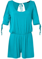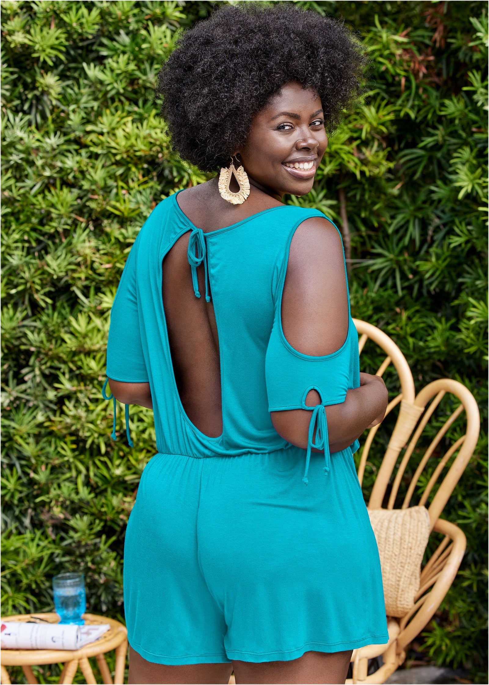 One packable piece that just makes sense for your vacay—this Cold-Shoulder Romper that doubles as your lunch look and beachside hangs style! The open back adds allure to the classic styling with a tie that secures for your ideal fit. Deep cold shoulders with ties match the skin-baring appeal. * Sizes: S (4-6), M (8-10), L (12-14), XL (16) * Plus sizes: 1X (18-20), 2X (22-24), 3X (26-28) * Wide open back with functional tie closure * Cold shoulders finish with ties * Rayon/spandex. Imported