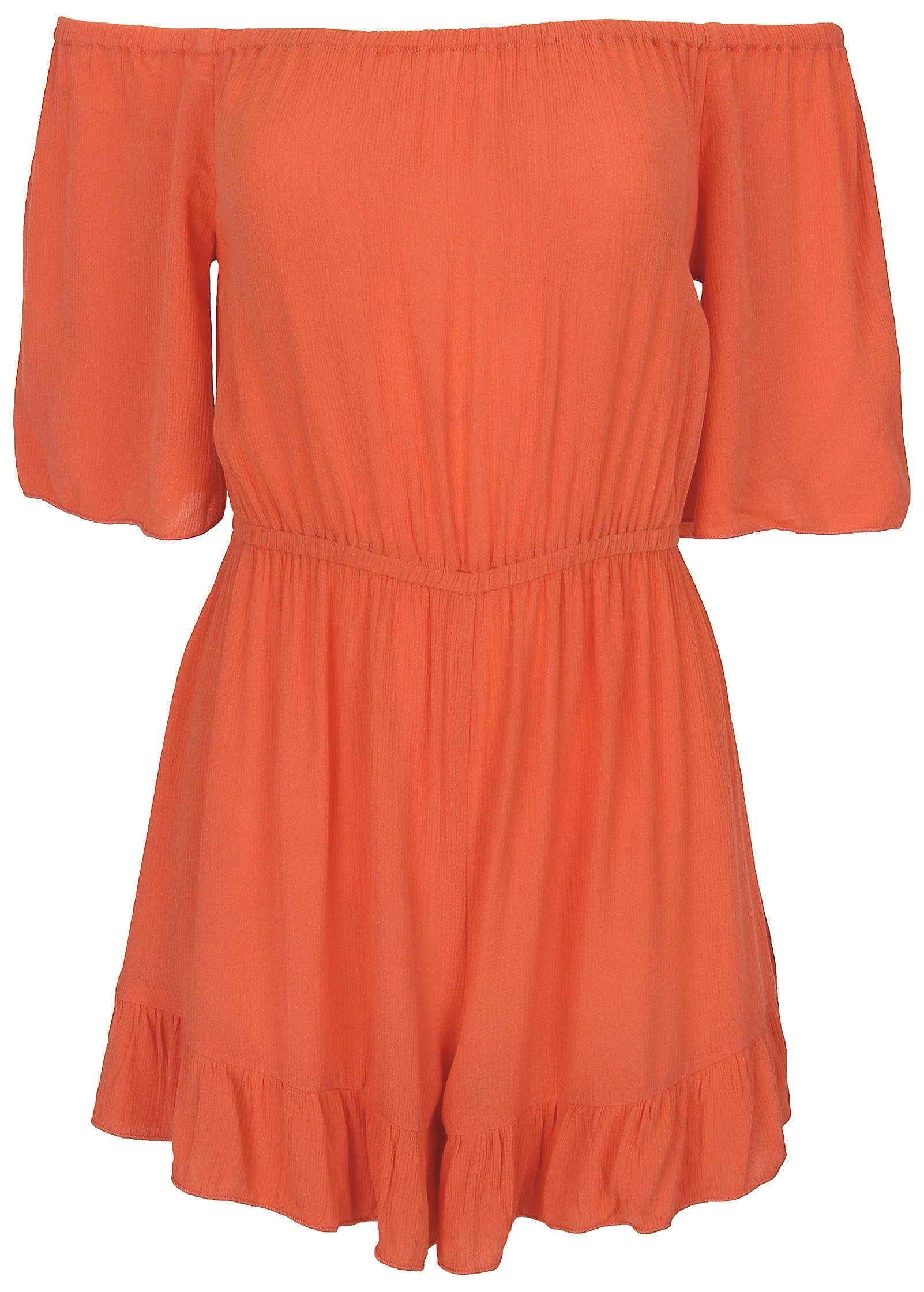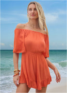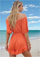 Beach day or date on the boardwalk? Either way, you're covered in this flirty romper. Show off your sun-kissed glow with an off-the-shoulder neckline and short, flowy shorts. Slide it on over your favorite VENUS swimsuit for daytime or add your favorite flats for a versatile look.