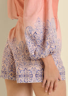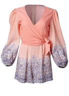 We've created the outfit: All you need to do is accessorize! Add this romper to your wardrobe and enjoy the ease of the wrap-look bodice that finishes with a flirty tie. Balloon sleeves add volume, while the ombre print with paisley at the hem and cuffs brings unique flair that always attracts attention. * Available in plus sizes * Tie detail at waist * V-neck with wrap look * Back zipper closure * Balloon sleeves with elastic cuffs * 3.5" inseam * Fabric has some stretch * Viscose/cotton/linen. Imported