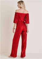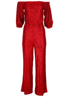 Off-Shoulder Sequin Jumpsuit - Goji Berry