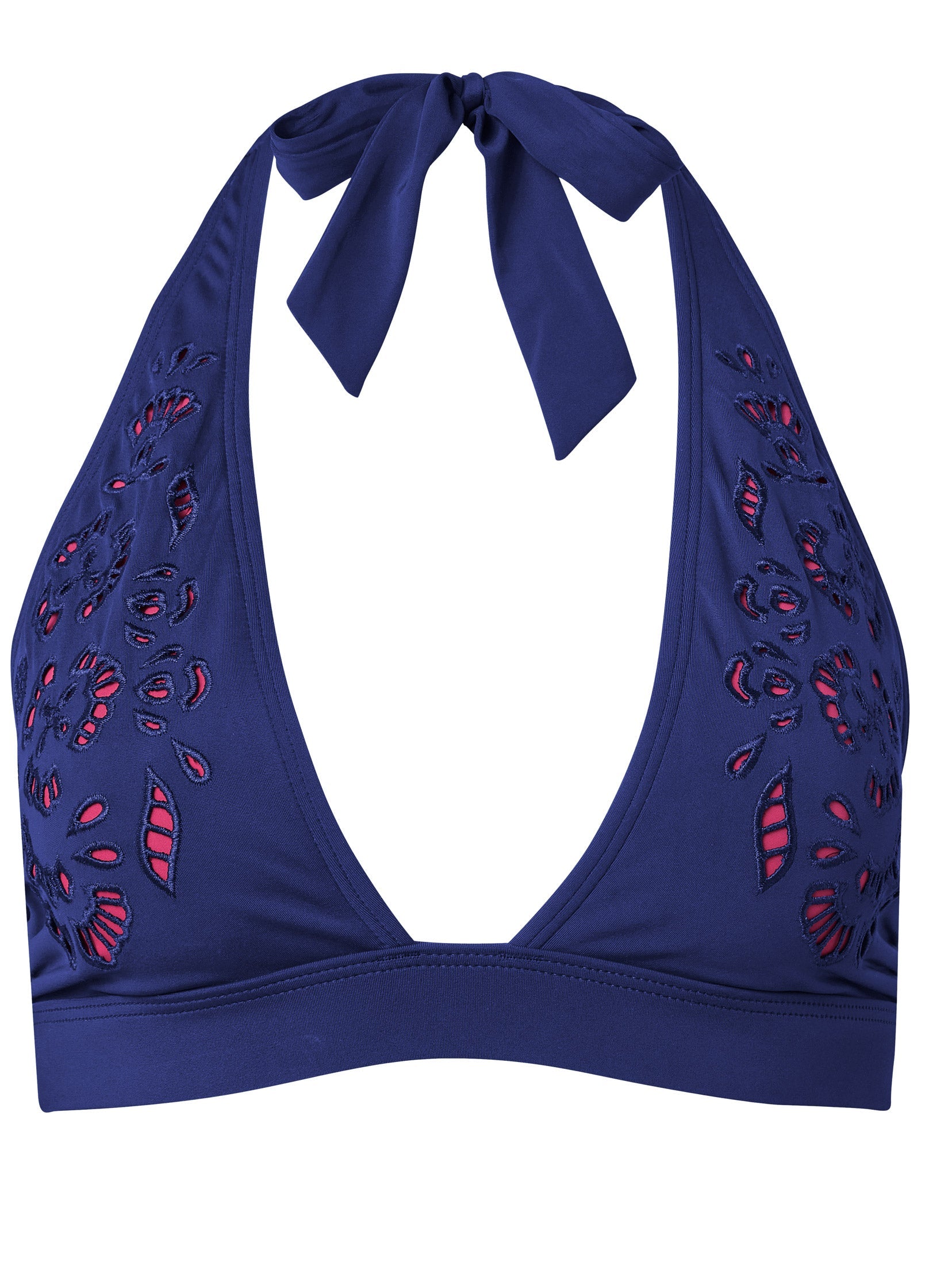 Bring the flirt to your bikini look when you pull on this eyelet detailed halter top with underbust band! Sash ties secure behind the neck and back, letting you find the right fit for your day in the sun. Contrasting lining peeks through the eyelet detail to add an extra eye-catching pop.