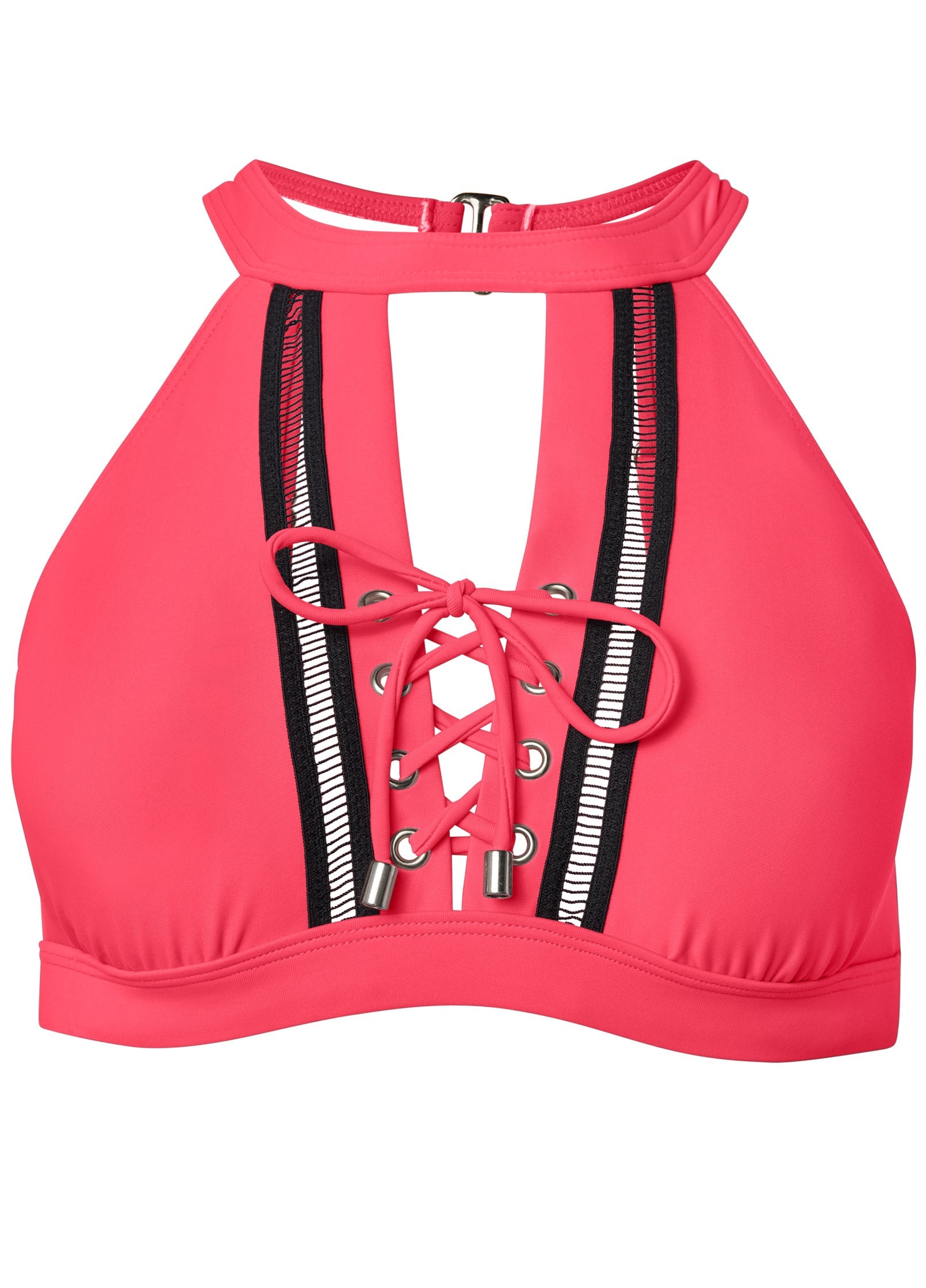 Swimwear as bold as this choker-style high-neck top deserves to be packed for your next destination! The wide front keyhole assures extra appeal with a lace-up detail and sheer insets outlining that opening. The squared-off back assures you make a statement from every angle.