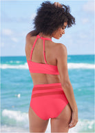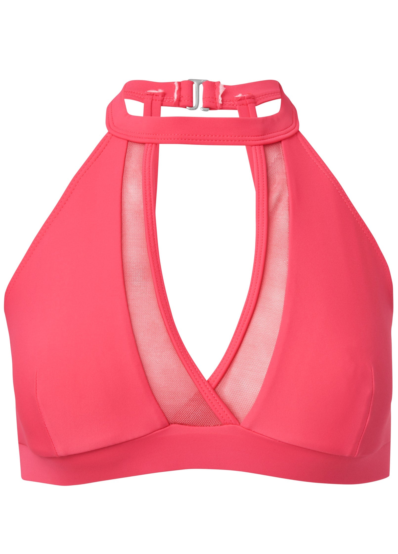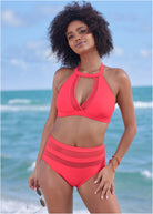 Sun, sand and a standout swimsuit...the perfect warm-weather combo! You can cross one of those off your checklist with this choker-style high-neck top that boasts a wide front keyhole outlined with sheer mesh panels. Straps at the wide back adjust to just the right fit in this sporty-meets-sultry piece.