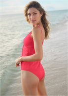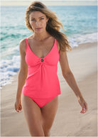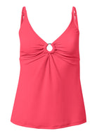 With coverage at the bodice and a V-neckline, this tankini top assures just enough modesty with a revealing twist! Gathers surround the metallic ring at the center front, assuring a figure-flattering silhouette that flares slightly down to hip length. Add matching bottoms and you're set for a day in the sun.