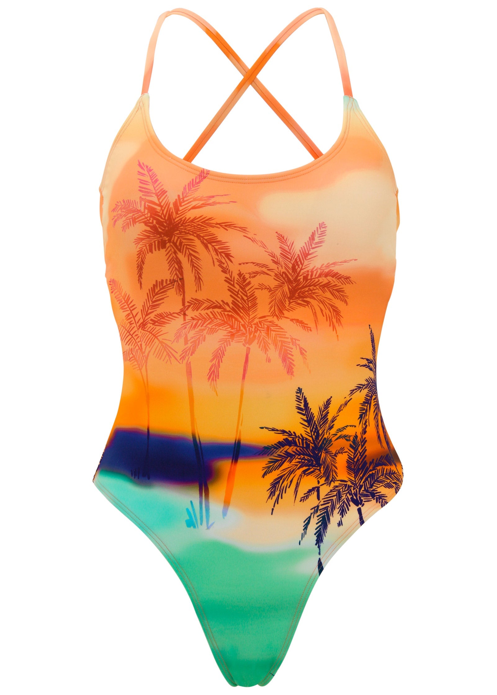 Paradise is just a swimsuit away and this one-piece is your one-way ticket. In the front it's super sleek with a scoop neckline and mid-leg cut. The back, on the other hand, is a total party with crisscross straps, a playful cutout and midi coverage. Whether you take a dip or not, this suit makes a splash. * Removable padding * String ties at back * Mid-leg cut * Midi coverage * Poly/spandex tricot. Imported