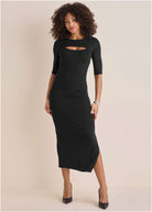 Turn heads in the Front Cut Out Maxi Dress—a flirty, curve-loving style made to stand out. The sleek crew neckline, bold front cutout, and leg-baring side slit create a perfect balance of classy and daring, all wrapped in soft, stretchy fabric that hugs in all the right places.