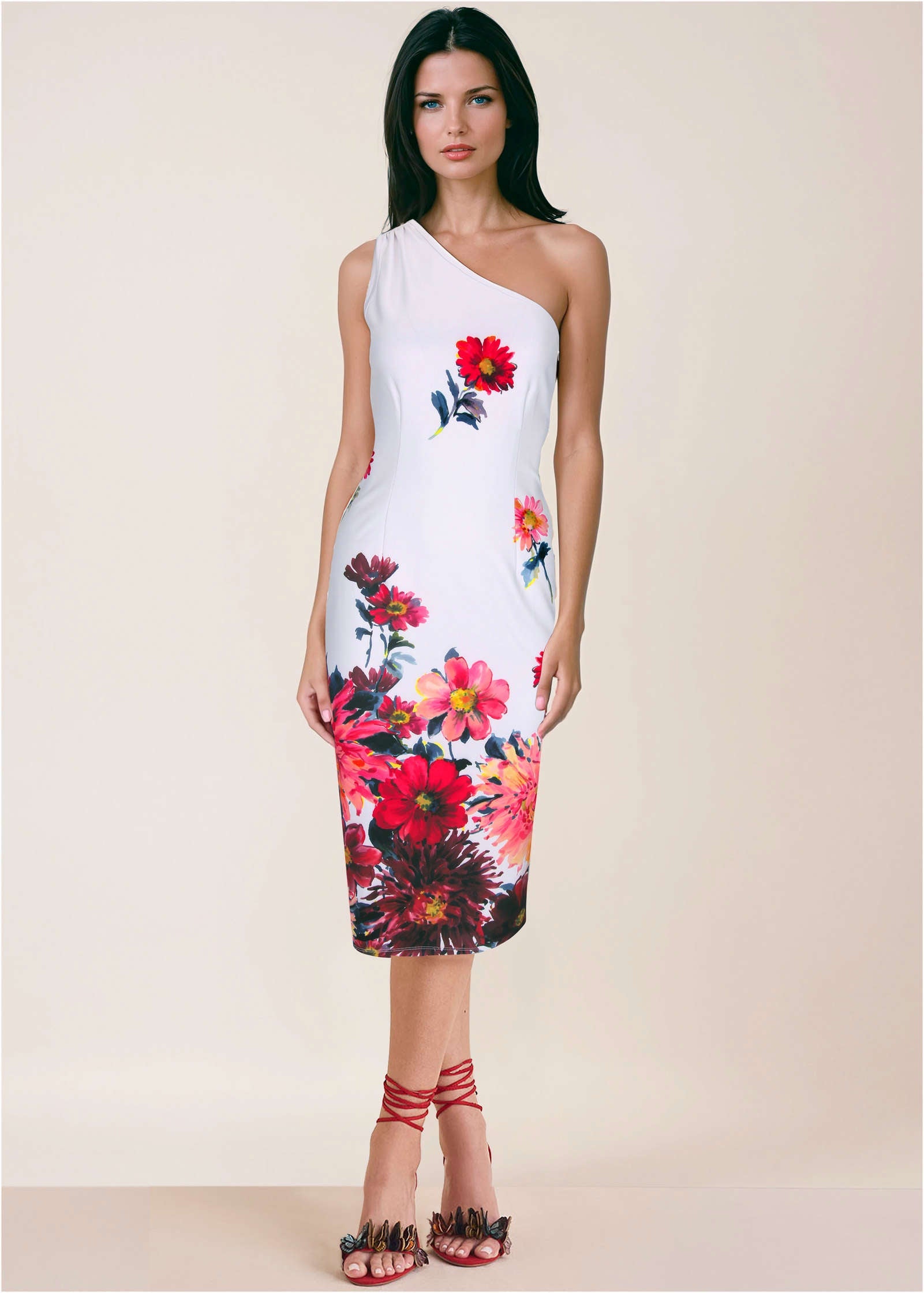 One Shoulder Scuba Dress - Spring Dahlia Border