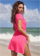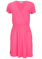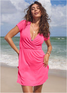 Cover up while still showing off—this effortless dress is made for beach days that turn into town strolls. The wrap-style top gives a flirty peek at your swimsuit, while the elastic waist and side slits keep things breezy. Throw it on over your swimsuit and pair with sneaks or sandals for an easy, sun-kissed daytime look! * Sizes: XS (2), S (4-6), M (8-10), L (12-14), XL (16) * Plus sizes: 1X (18-20), 2X (22-24), 3X (26-28) * V-neckline & wrap-style top: Flirty and flattering. * Short sleeves & elastic waist: Easy, comfortable fit. * Side slits: Adds movement and a little sass. * Viscose/elastane. Imported