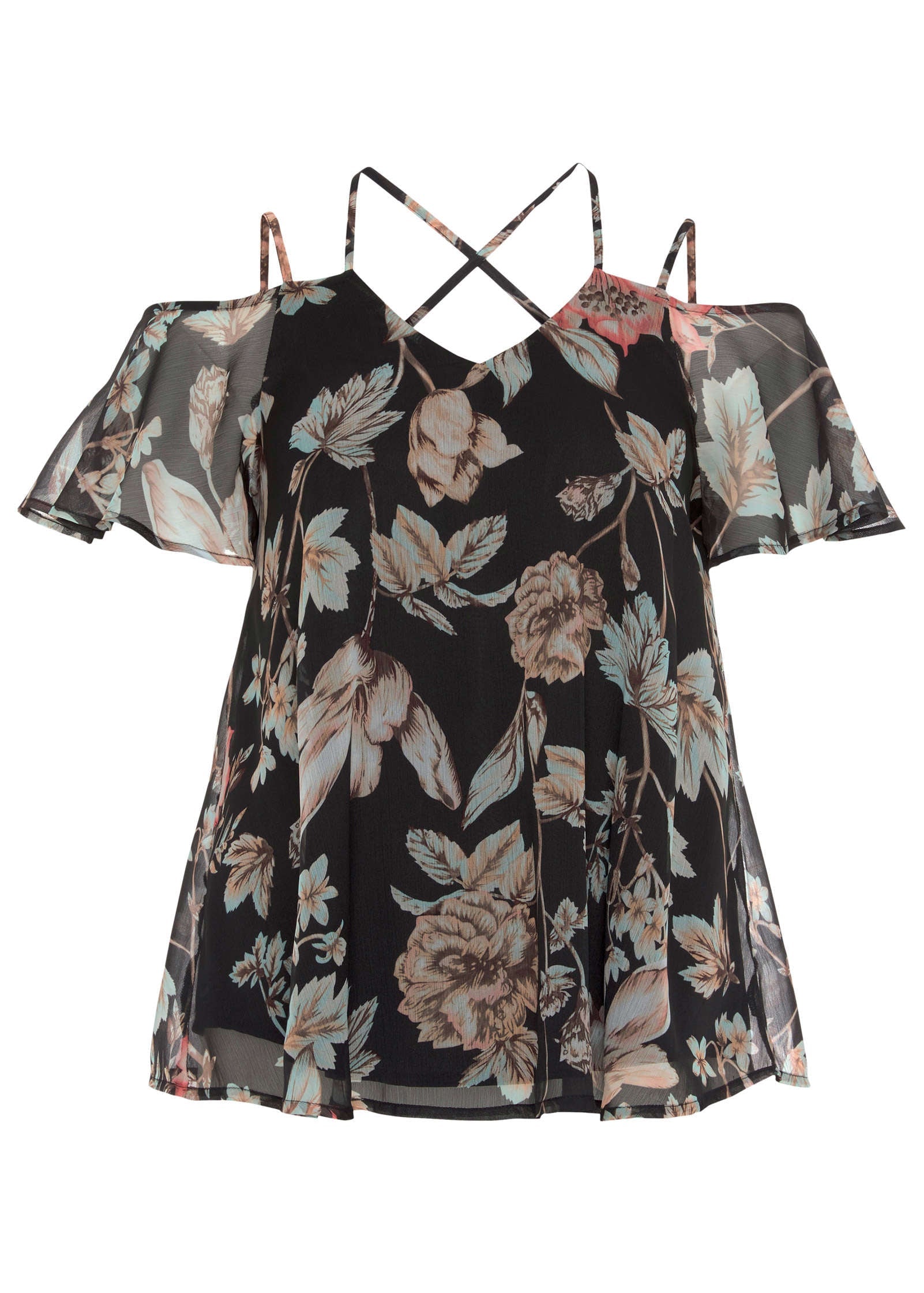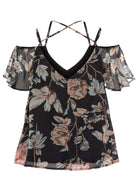 This top doesn't skimp on the feminine details! Between the dreamy floral print and the whispy flutter sleeves, you'll be swooning. Toss in the flirty cold-shoulder silhouette and the strappy details and you've got yourself a piece that works for both day or night.