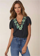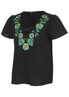 Boho, breezy, and effortlessly chic—this embroidered blouse is a warm-weather essential. The V-neckline is framed with intricate embroidery, while the delicate tie detail adds an extra touch of charm. Short, slightly-puffed sleeves create a romantic silhouette, perfect for pairing with anything from denim to floaty skirts. Tuck it into shorts or pants for an easy, polished look, or go full-on boho by styling it with a flowy skirt. No matter how you wear it, this blouse is ready for sunshine and adventure. * Sizes: XS (2), S (4-6), M (8-10), L (12-14), XL (16) * Embroidered neckline: Intricate detail adds a touch of boho charm. * Flattering V-neckline: Effortless and easy to style. * Short puffed sleeves: A breezy, romantic silhouette. * Versatile styling: Tuck into pants or shorts for everyday wear, or pair with a flowy skirt for a dreamy boho look. * Viscose/cotton (CmiA)/linen. Imported
