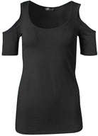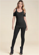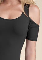 Trendy cold-shoulder styling meets long and lean versatility! Reach for this bodycon-fit top that offers rear coverage when you want to toe the line between revealing and reserved. Open cold shoulders and a scoop neckline show peeks of skin, while the curve-skimming silhouette can be styled to go anywhere.
