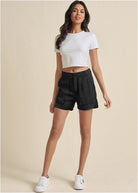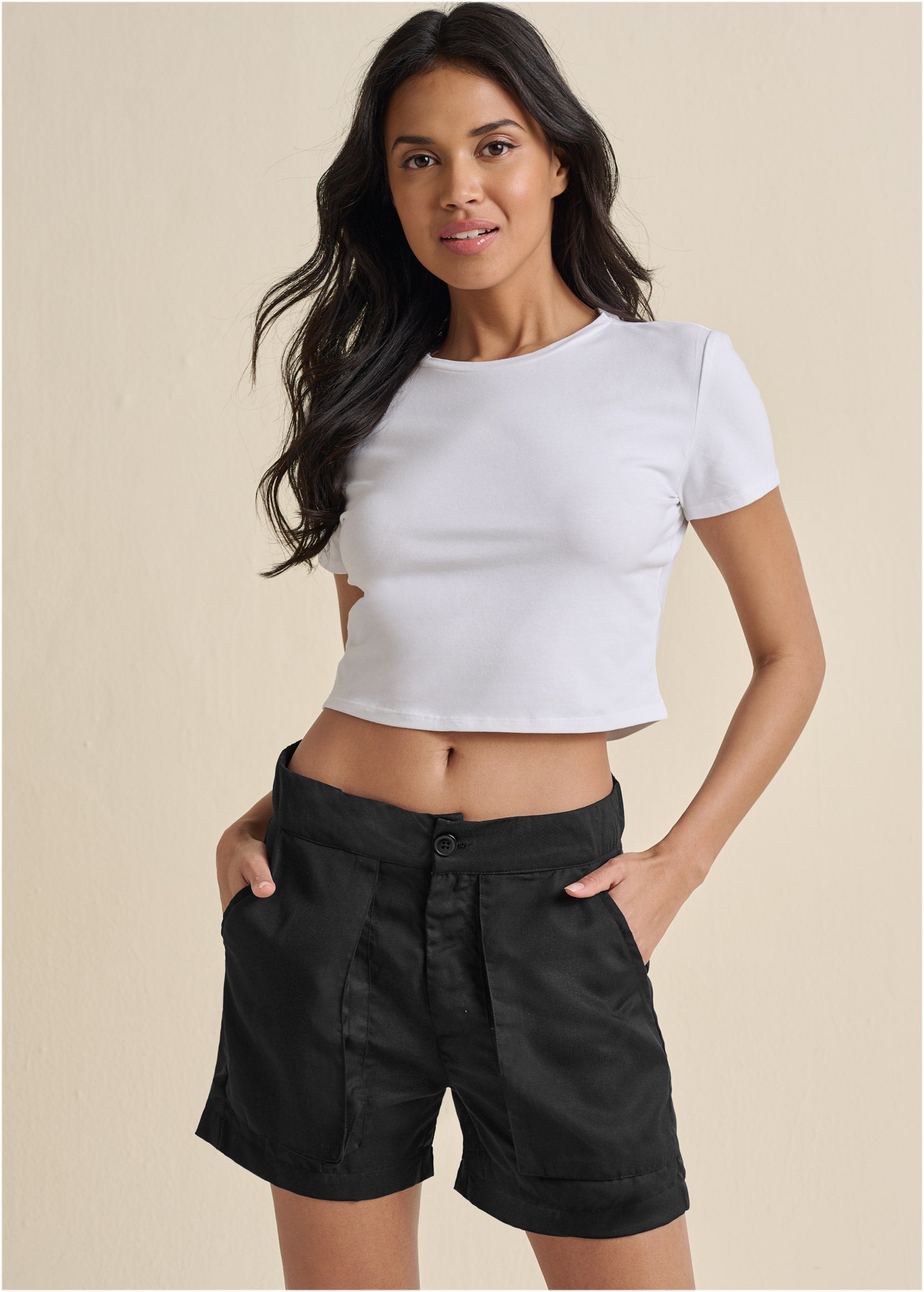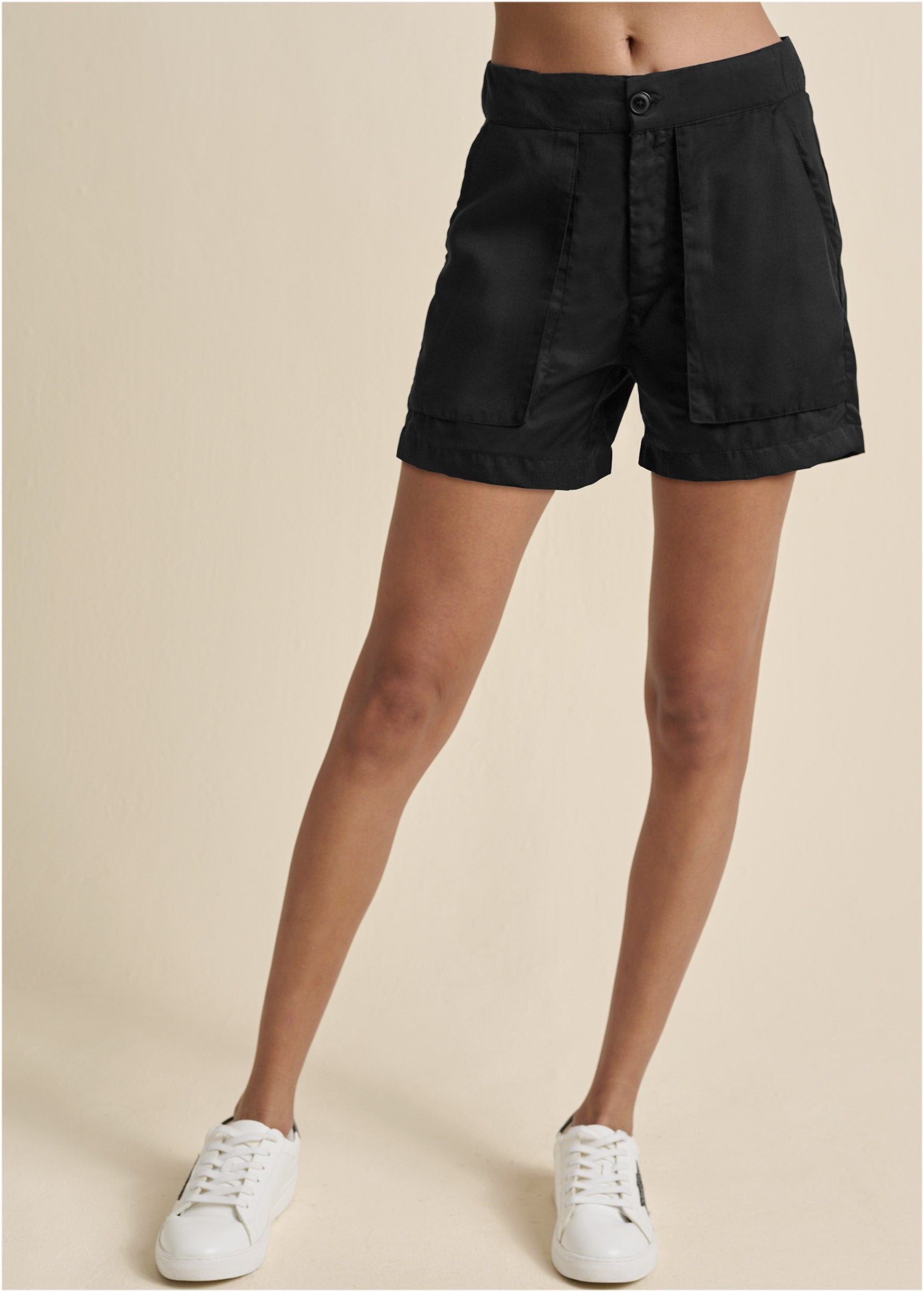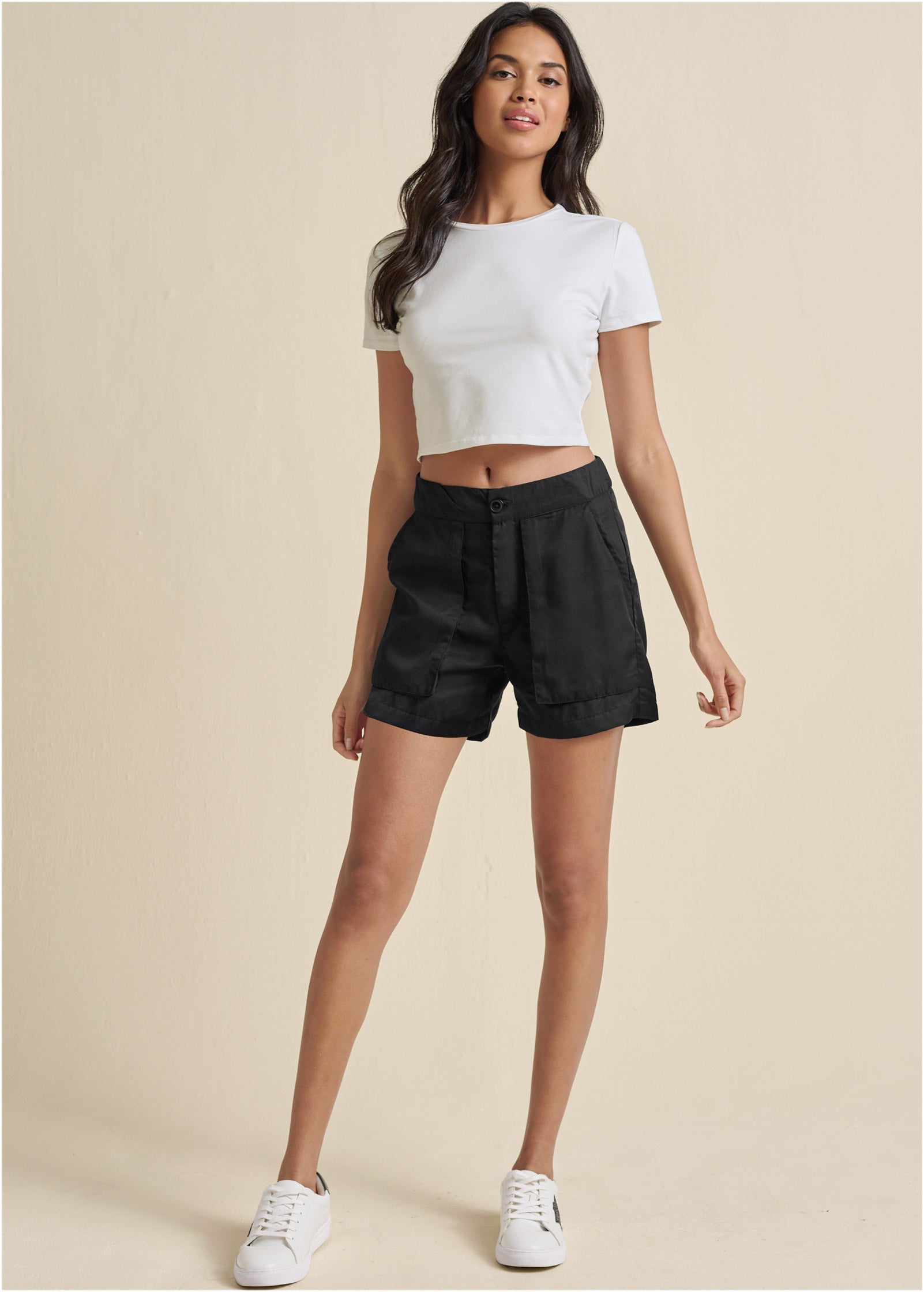 Take a walk on the trendy side! Crafted with a drapey fabric that moves with you, these walking shorts are made for getting out and about. Pleating adds structure, while the high waist and loose fit, not to mention the side pockets, make this practical pair perfect for quick strolls or long days outdoors. * Available in plus sizes * High rise * Zipper/button closure * Loose fit with oversize pockets * 3.5" inseam * Fabric does not have stretch * Lyocell. Imported