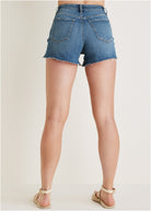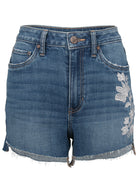 Make room on your short list for this unexpected pair. Cooler than your average denim cutoffs, these jean shorts have a raw-edge step hem with a laid-back and effortless feel. Floral embroidery down the left leg has a hand-stitched, artisan look giving this pair a boho vibe.
