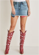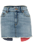 Coordinating with the flag is this denim skirt's favorite holiday tradition. Designed with comfortable stretch, this micro mini is ready for all your summer celebrations. With stars-and-striped pockets peeking out from its effortless frayed hem, this true-blue jean skirt makes every moment patriotic!