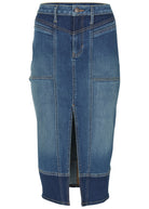 A classic with a flirty twist, the Denim Midi Skirt is your new go-to for effortless style. Designed with a sleek midi length and a front slit for just the right amount of movement, this skirt is as versatile as it is chic. Whether you're dressing for transitional weather or looking for an easy day-to-night piece, this form-fitting silhouette is ready to serve. Pair it with a tight tee for an extra-flirty vibe, or style it with a cozy sweater and boots for cooler days.