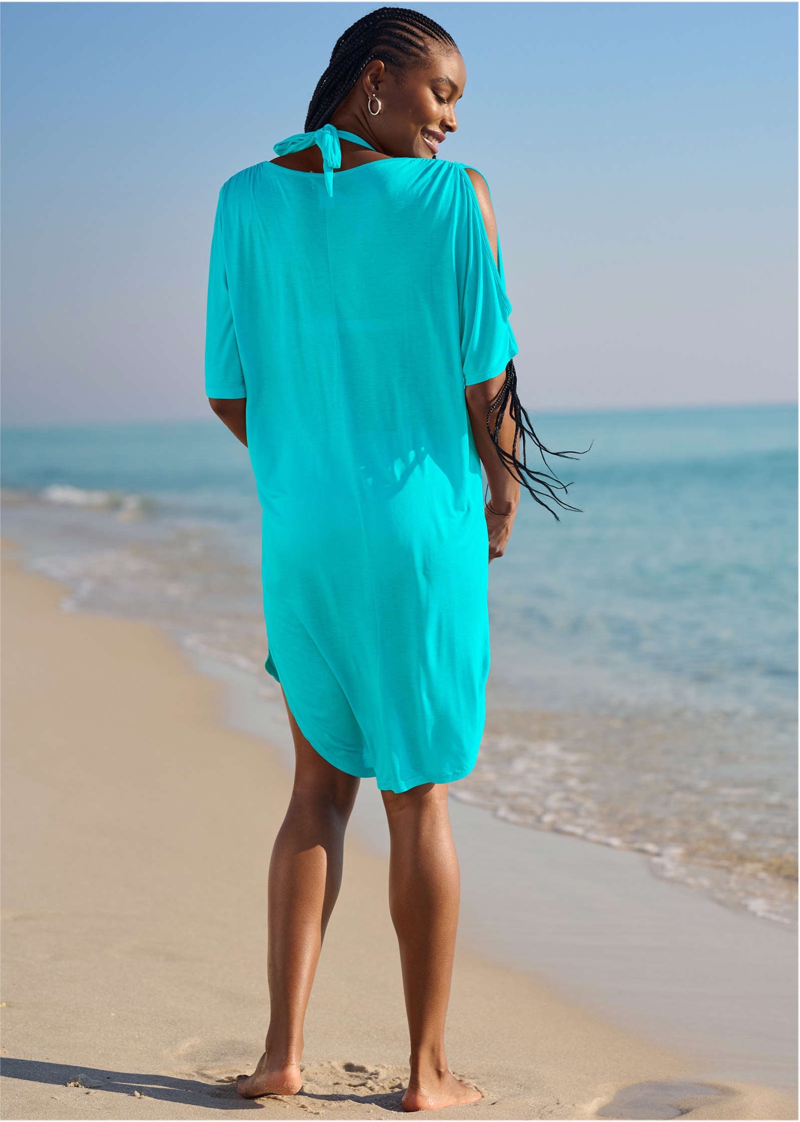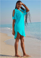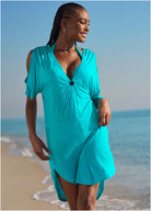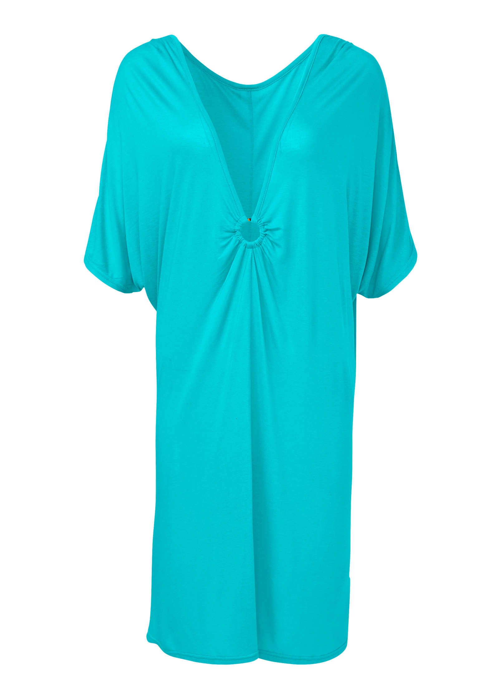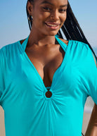 Pull this cover-up over your favorite suit for apres-swim adventures! With its plunging V-neck and open ring detail at the front, this style reveals your flirty side while keeping you concealed until it's time to take a dip. Dolman sleeves add to the loose fit of this suitcase essential. * Sizes: XS (2), S (4-6), M (8-10), L (12-14), XL (16) * Plus sizes: 1X (18-20), 2X (22-24), 3X (26-28) * Dolman sleeves * Deep V-neck with ring at front * Viscose. Imported
