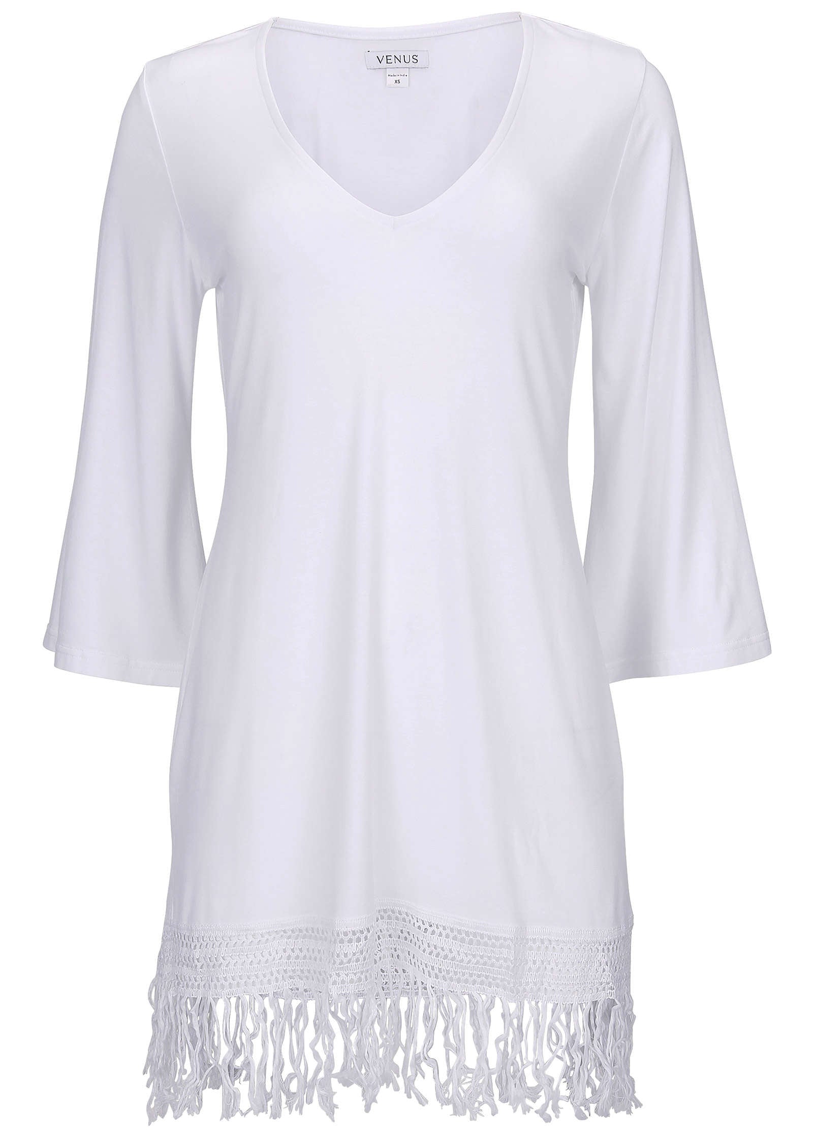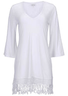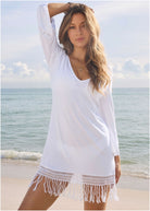 This knit tunic cover-up dress combines long bell sleeves with a fringe hem for a relaxed yet chic vibe. The V-neckline adds a touch of elegance, making it perfect for layering over your swimsuit while you stroll along the shore.
