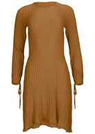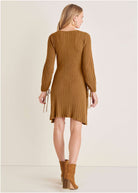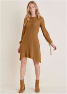 Sweater dressed to impress! This flared silhouette takes flattery to a new level, all while keeping you cozy with super-soft knit fabric. The tie detail at the sleeves offers a feminine feel while the classic cable knit design and flirty asymmetrical hem make this piece a timeless addition to your wardrobe.​ * Sizes: XS (2), S (4-6), M (8-10), L (12-14), XL (16) * Plus sizes: 1X (18-20), 2X (22-24), 3X (26-28) * Available in petite sizes * Mini length; from shoulder: 35" missy, 37" plus, 33" petite * Long sleeves * Tie detail on sleeves * Fabric has stretch * Cotton/acrylic. Imported