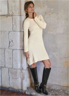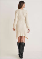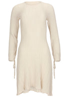 Sweater dressed to impress! This flared silhouette takes flattery to a new level, all while keeping you cozy with super-soft knit fabric. The tie detail at the sleeves offers a feminine feel while the classic cable knit design and flirty asymmetrical hem make this piece a timeless addition to your wardrobe.​ * Sizes: XS (2), S (4-6), M (8-10), L (12-14), XL (16) * Plus sizes: 1X (18-20), 2X (22-24), 3X (26-28) * Available in petite sizes * Mini length; from shoulder: 35" missy, 37" plus, 33" petite * Long sleeves * Tie detail on sleeves * Fabric has stretch * Cotton/acrylic. Imported