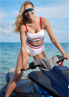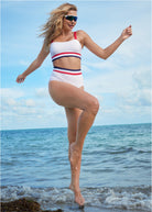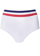 A playful look for splashing in the surf, this retro-chic bottom is shaped in a high-waisted silhouette and finished with a sporty striped band to define the waist in a flattering way. The moderate back coverage is a perfect balance of classic and flirty.