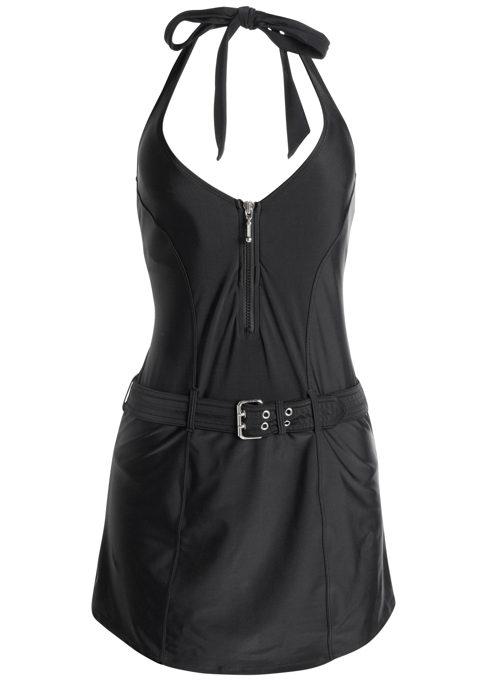 Similar to a one-piece but with a little more hip and leg coverage, this swim dress assures the freedom to enjoy your day by the water. The Hold-U-In lining gives a smooth fit while the decorative belt shapes your waist. Zip the front and tie the halter sash to personalize the fit and support.
