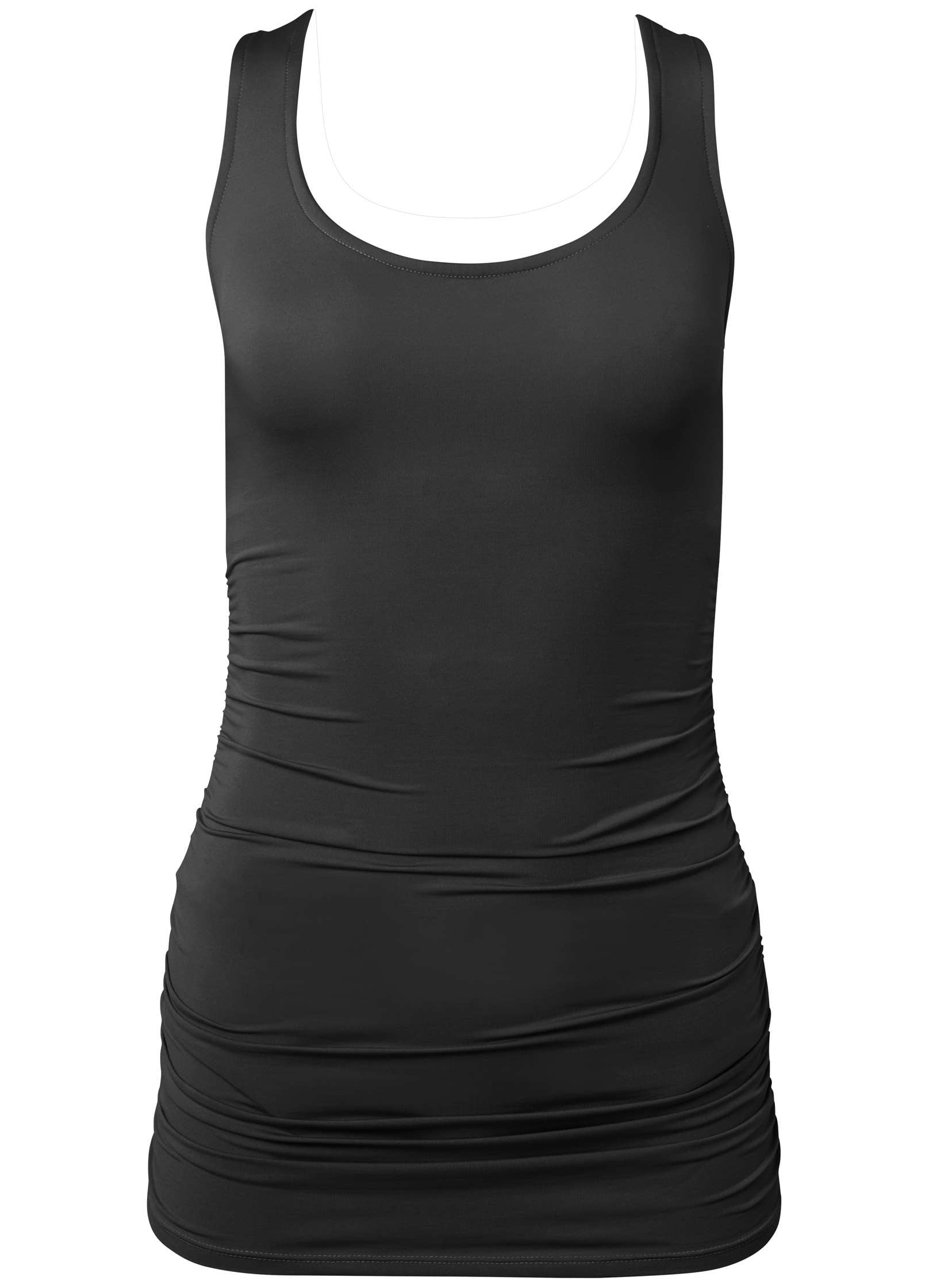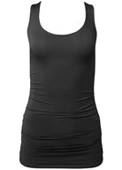 Get the coverage you love in a swim silhouette that flatters! This swim dress features gathers along the bodice that smooth with a low scooping back that reveals just enough skin for extra allure. Sitting just below the rear, this pretty one-piece assures family-friendly coverage for days at the beach.