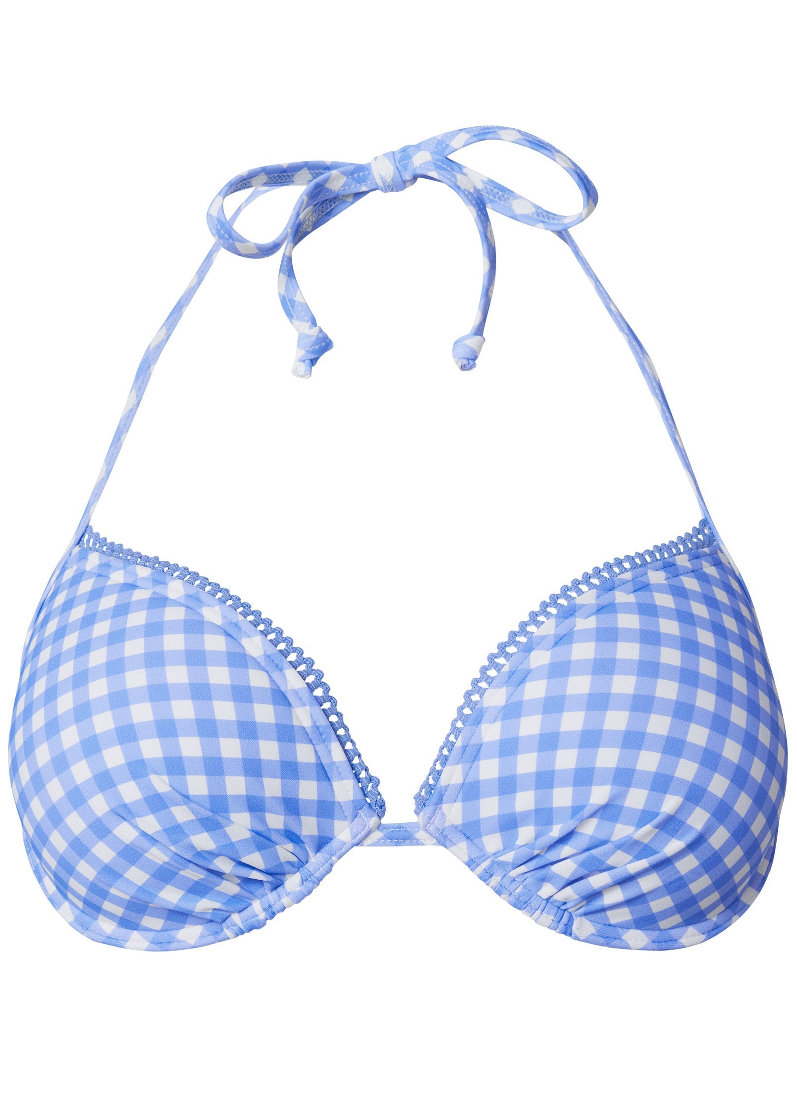 Let this enhancer top allow your natural beauty to shine! With the help of molded cups and an underwire, you can flaunt your curves with confidence while enjoying days in the sun. Intricate trim lines the edges of the cups that boast gathers for a smoothing effect. * Tie closure at neck and back * Molded cup with underwire * Domestic or import of quality nylon/spandex tricot