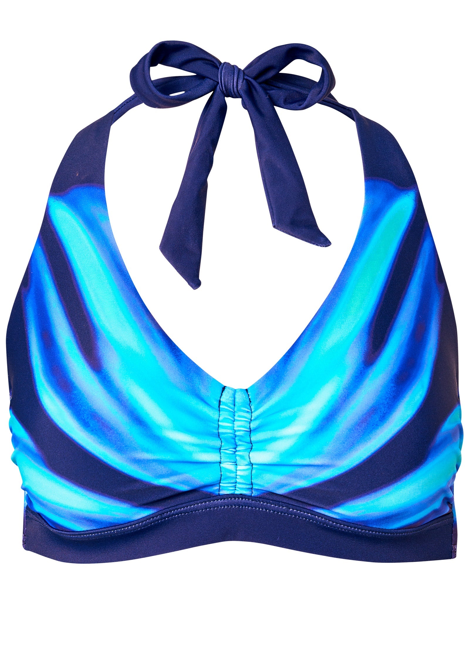 With ruching across the bust, it's no wonder this bikini top has "heavenly" in its name! The ruched detailing smooths, while wide halter straps that tie at the neck add lift. An adjustable slider back strap assures your most flattering swimsuit yet in this halter that both conceals and reveals.