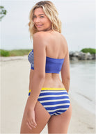 Mid-rise bottom is trimmed with a contrasting fabric band to make a statement and add a pop of color. A bold stripe print elevates them with just-right modest back coverage.