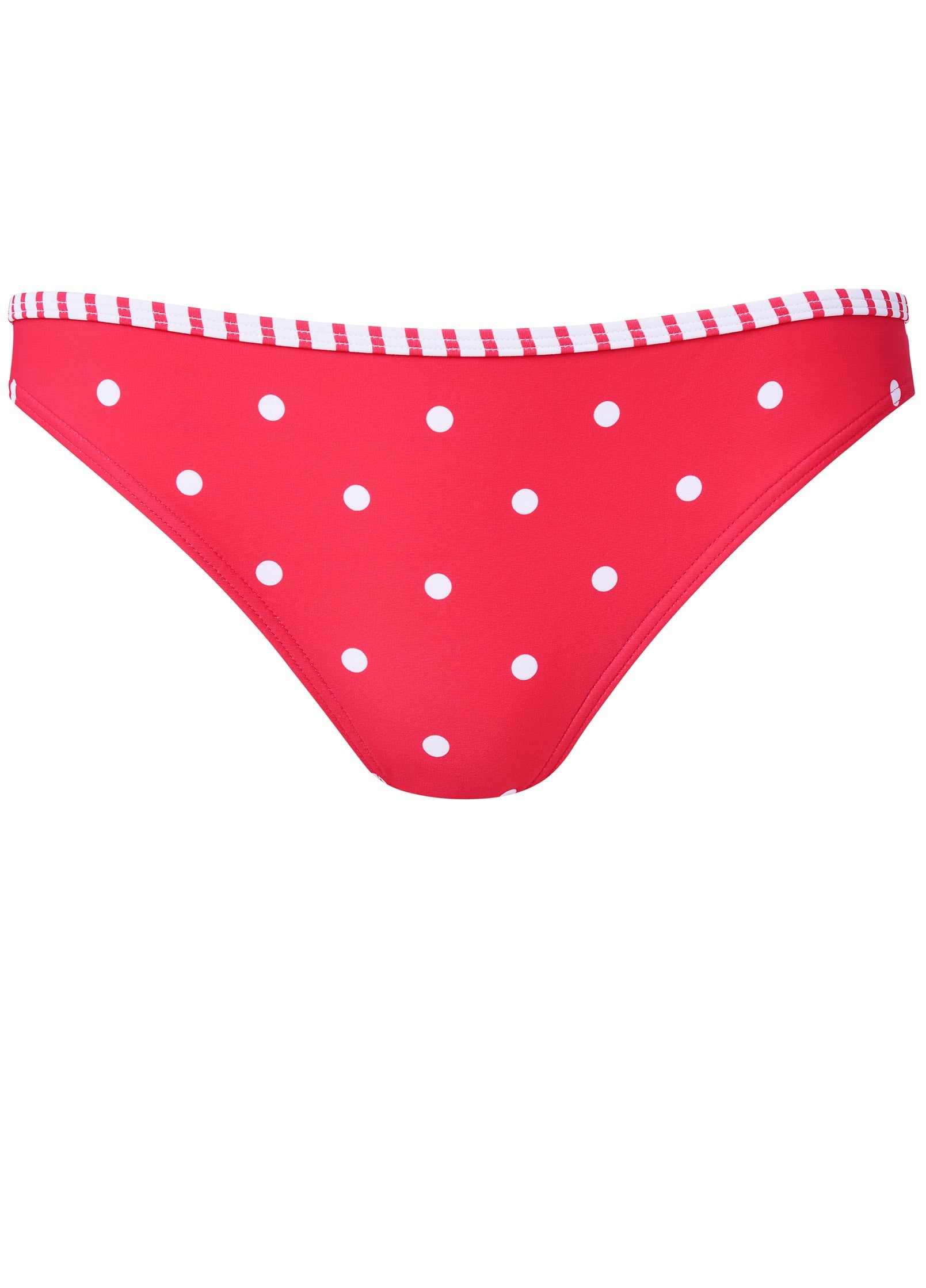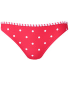 A simply stated classic, this low-rise bikini bottom is worn low and straight across the hips and features moderate rear coverage. This style's pretty polka-dot print is trimmed with classic stripes for playful contrast.