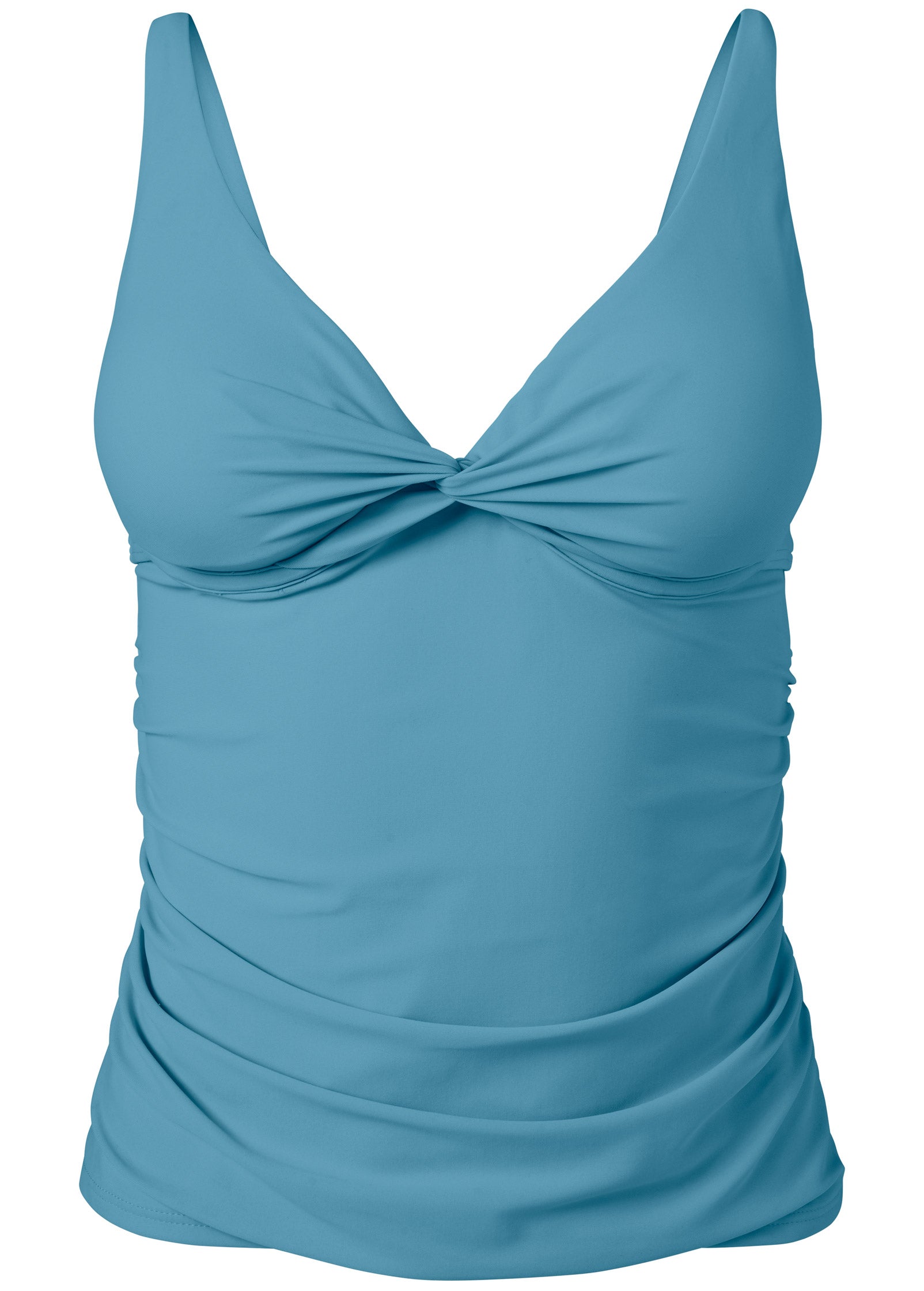 * Ruching at side for slimming effect * Push up with removable cups * Underwire tankini top * Adjustable straps * Twist in front * Some colors of this style are made of recycled fabric. For more information, see MORE DETAILS * AQR, BKK: Domestic or import of quality recycled nylon/spandex tricot * All other colors: Domestic or import of quality poly/spandex tricot
