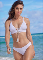 The classic scoop-front silhouette gets an ultra-feminine twist! Eyelet detailing covers the front and full back to give the familiar bottoms something extra. Add the matching top and you're set for any day in the sun.