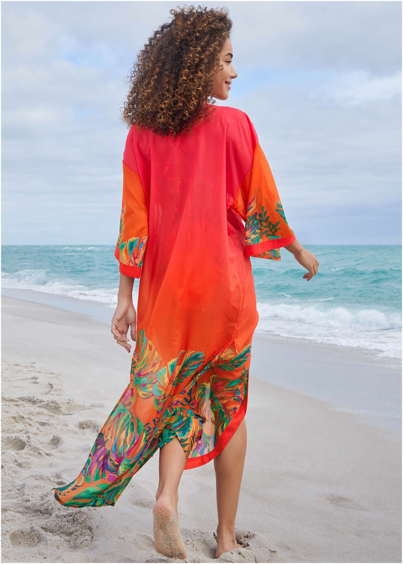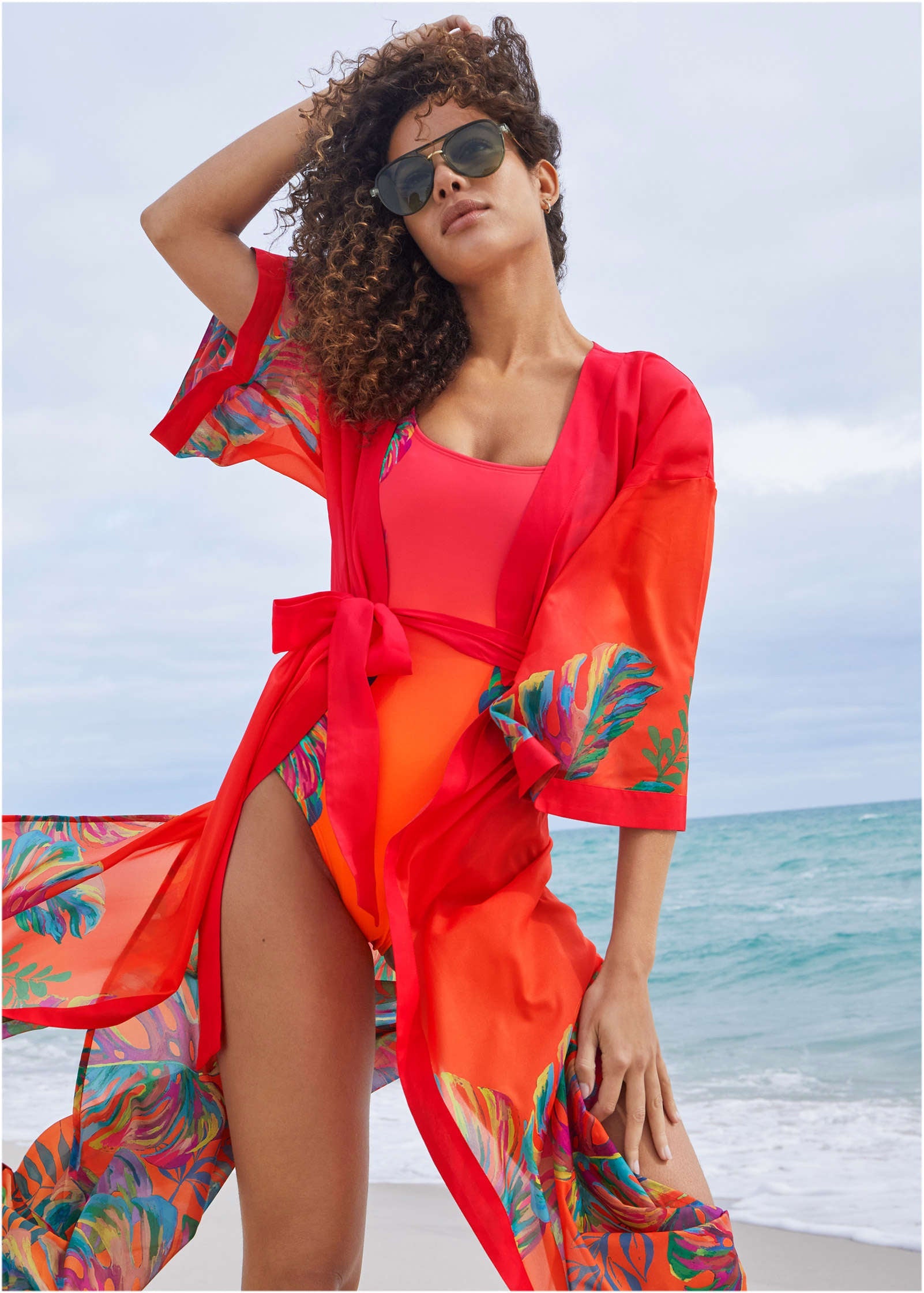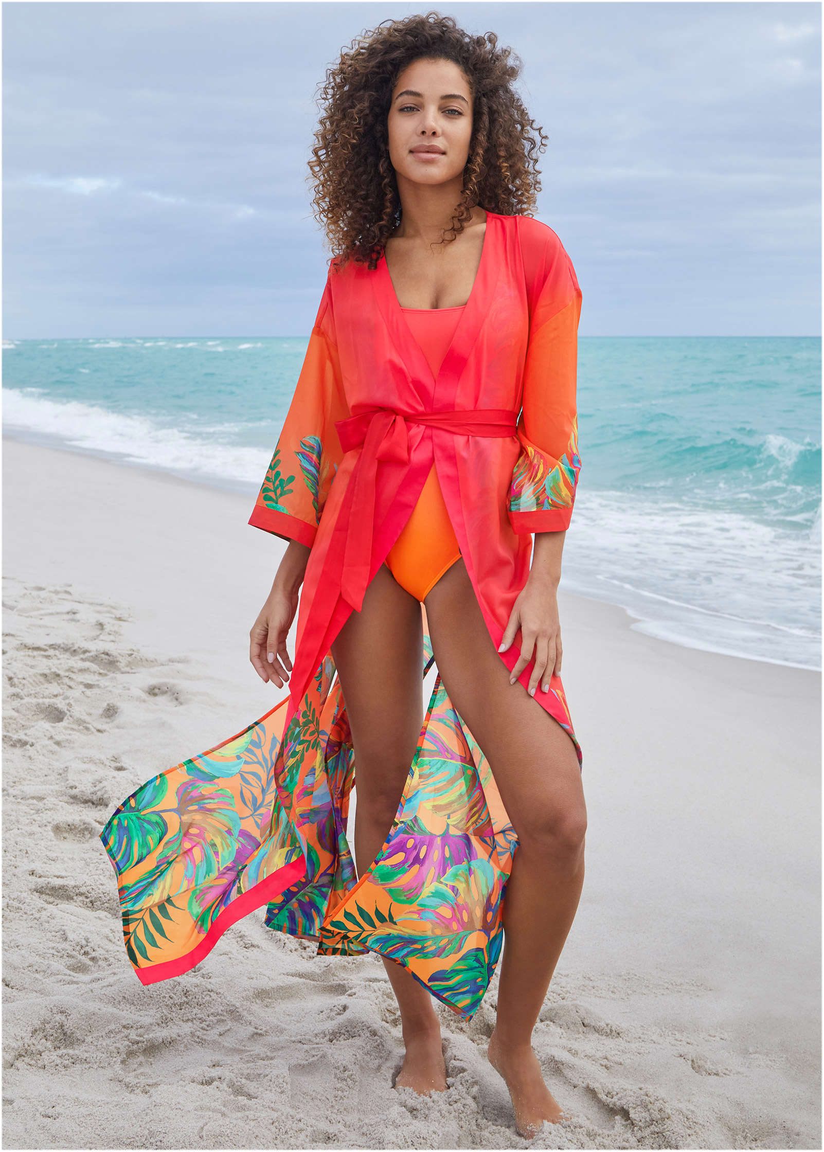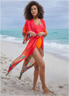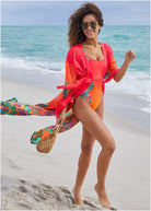 Be the brightest on the beach in this vibrant kimono cover-up. A celebration of tropical tones and bold botanicals, this post-swim layer is ready for its moment in the sun. Toss it over your suit and let the compliments roll in.