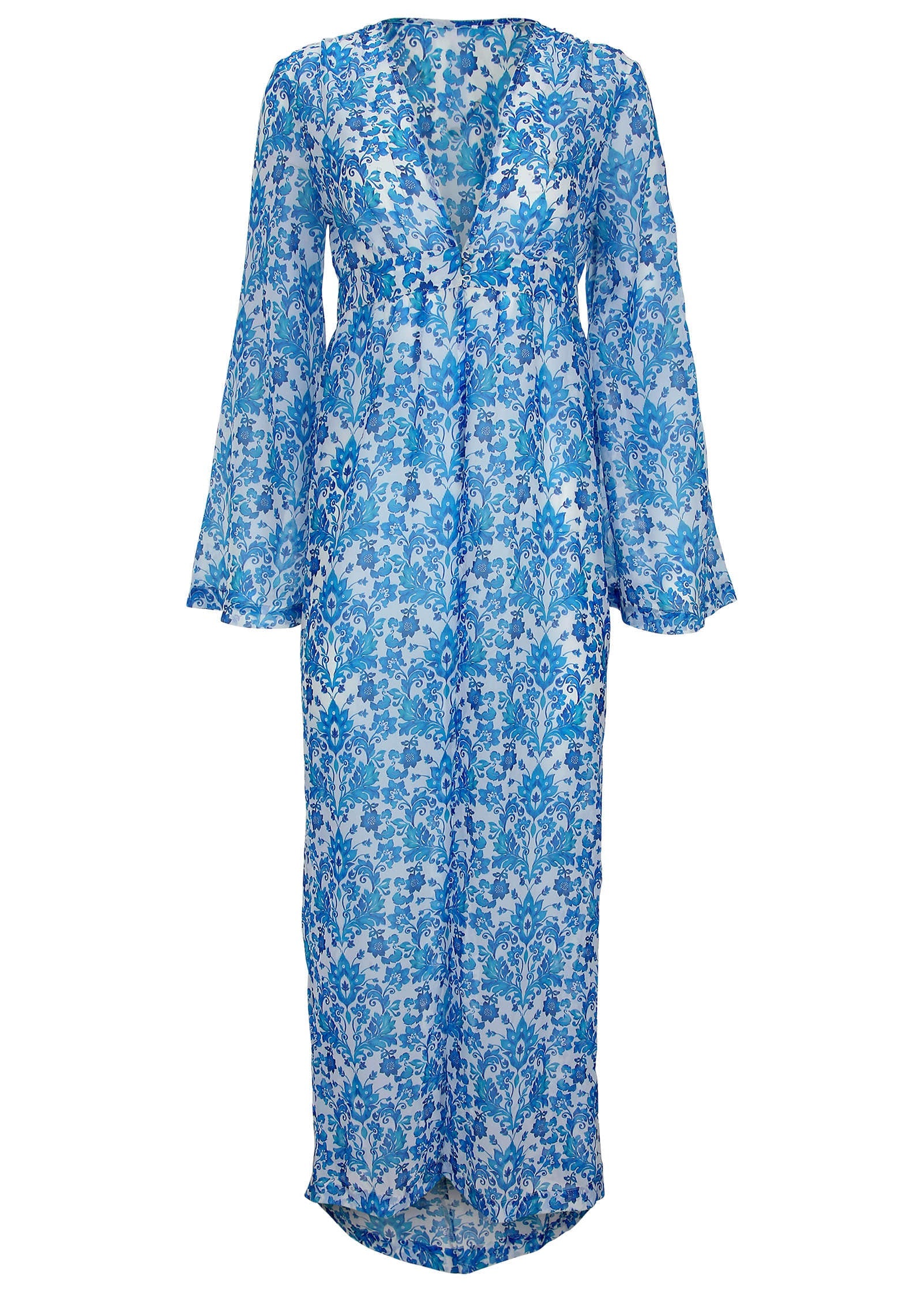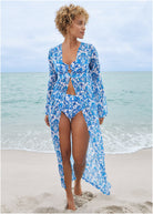 You'll look like a sun goddess in this ethereal kimono cover-up. With bell sleeves and a breezy maxi silhouette, this sheer layer enhances and elevates any swim look. Button the empire waist panel to create an elegant shape or leave it undone and let this piece effortlessly fall open and dance in the breeze.