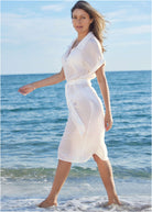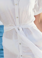 Breeze through beach day in this midi-length cover-up with a polished button-front finish. Collared neckline and cuffed sleeves give it the look of your favorite blouse, while the waist tie adds a shape-flattering detail your curves will thank you for.