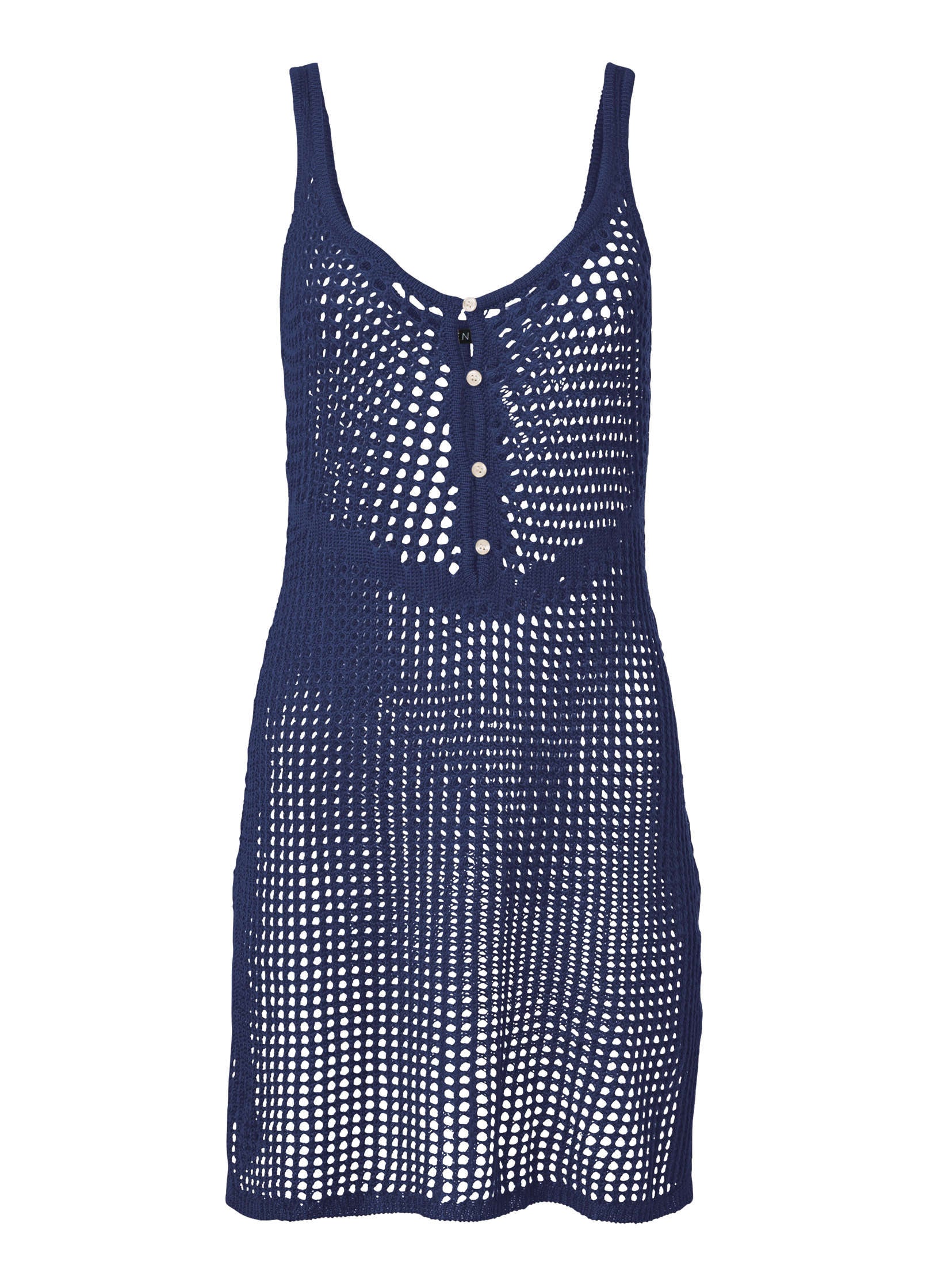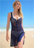 Enjoy just a hint of coverage as you soak up the sun with the open crochet knit that defines this cover-up dress! Tank straps and side slits mirror the barely-there coverage that keeps you cool even in the warmest temps. Front buttons secure the neckline and add a subtle detail that draws the eye up!