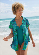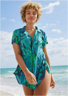 Nothing says resort-ready quite like a Hawaiian shirt! In a classic button-down silhouette complete with notched collar and cuffed short sleeves, this cover-up gets a feminine twist with its optional front-tie hem. Button as many (or as few) buttons as you'd like to make this piece your own.