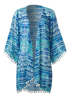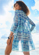 Lightweight coverage comes easy when you layer this semi-sheer cover-up over your suit! Tassels trim the edges of the hem and billowy sleeves, bringing a playful twist to the wrap-front bodice that can button closed, or be left open for a breezier fit.
