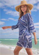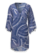 Lightweight coverage comes easy when you layer this semi-sheer cover-up over your suit! Tassels trim the edges of the hem and billowy sleeves, bringing a playful twist to the wrap-front bodice that can button closed, or be left open for a breezier fit.