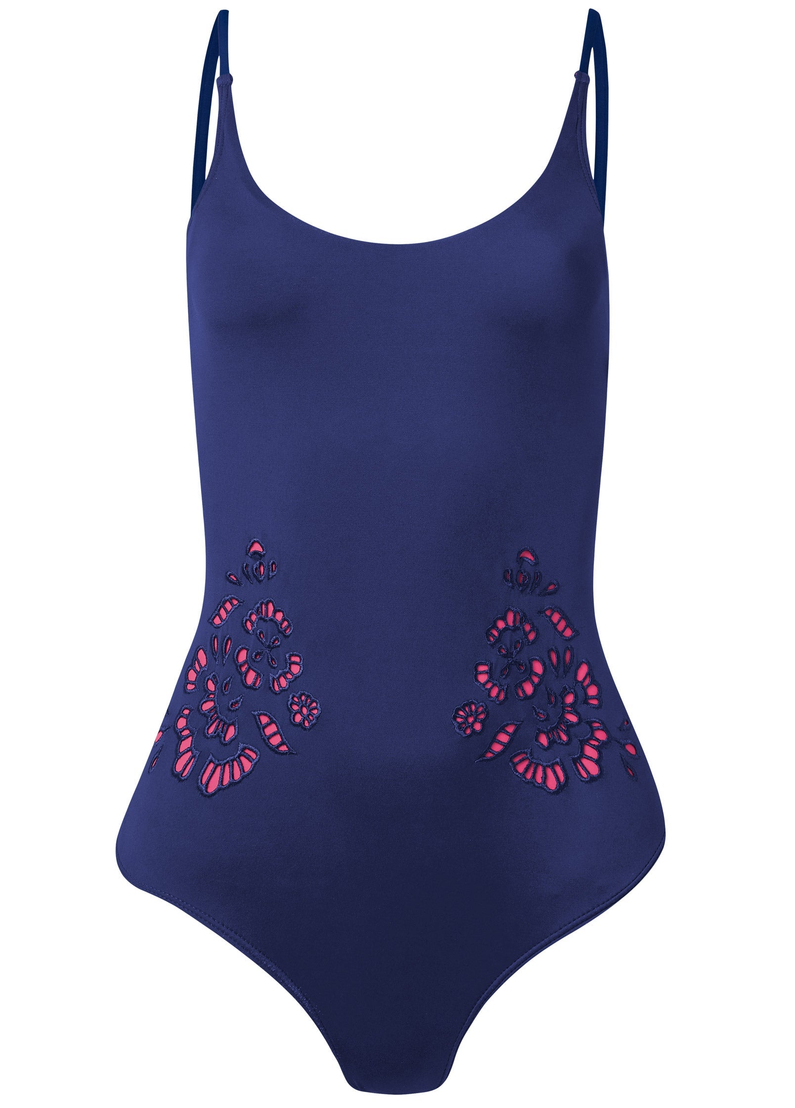 Coverage at the bodice meets the sexy scooping neckline and back of this one-piece that brings allure to beach getaways. Strappy details connect across the low back for an edgy-meets-modern twist that's in contrast with the feminine touch of lined eyelet on the front.